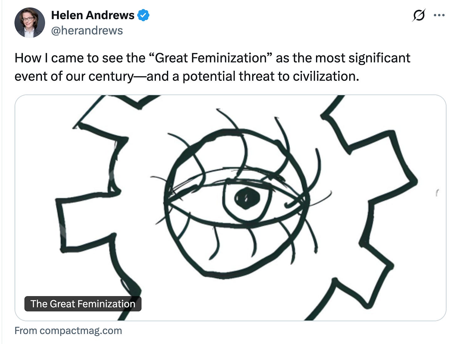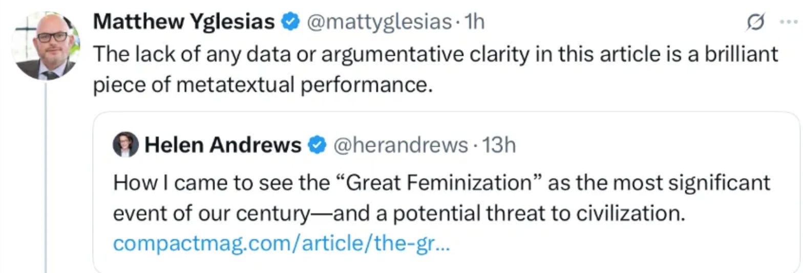 Other critiques come from David French, Richard Hanania, Audrey Horne, and Phoebe Maltz Bovy. One point that commentators have made is that it’s pretty bizarre right now to see the main threat to fields like academia and law as coming from empathetic women. They’re not the ones who are attacking the universities, slashing scientific funding, trying to throw dissenters in prison, and supporting crackpot theories of autism. As Hanania puts it,