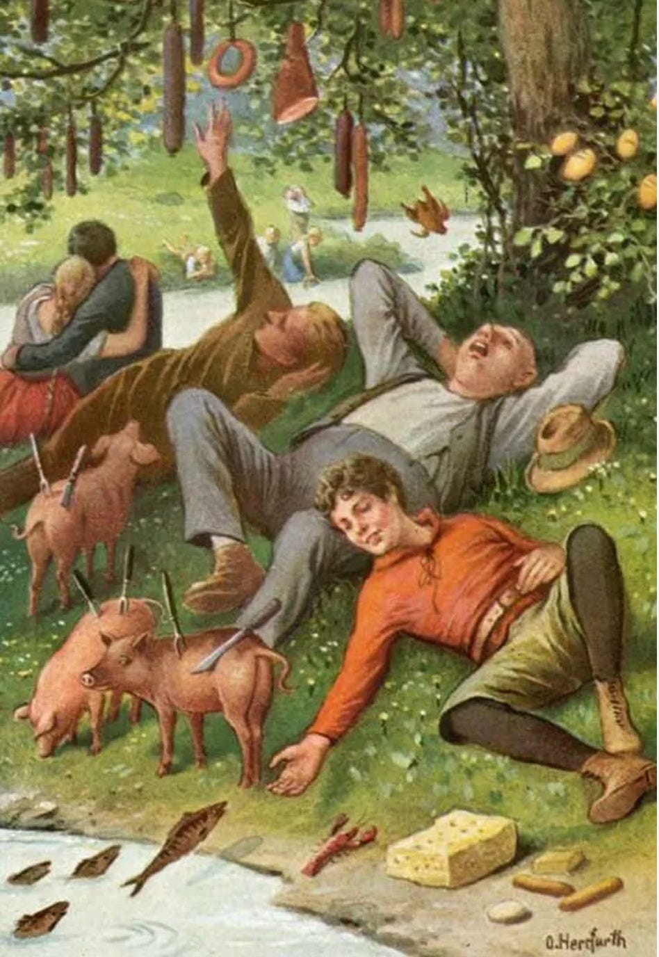 In the land of Cockaigne, there is no backbreaking labor under scorching sun or nipping north wind. No stale bread, no deprivation. Instead, we are told, cooked fish jump out of the water to land at one’s feet; and roasted pigs walk around with knives in their backs, ready for carving; and cheeses rain from the sky. Rivers of wine flow through the land.