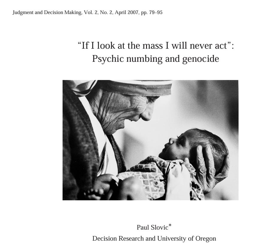 I wonder if the whole effect isn't exacerbated nowadays with the individual feeling of helplessness though, in the face of mass suffering, death and even genocide. Focusing on one (perhaps plucked FROM the relevant number) might allow us to do something, instead of feeling it's all pointless altogether because we not only cannot save them all, we cannnot even save a significant proportion: and yet the saved ones ARE saved, like in the story of the child on the beach throwing starfish back into the sea. It matters to them.