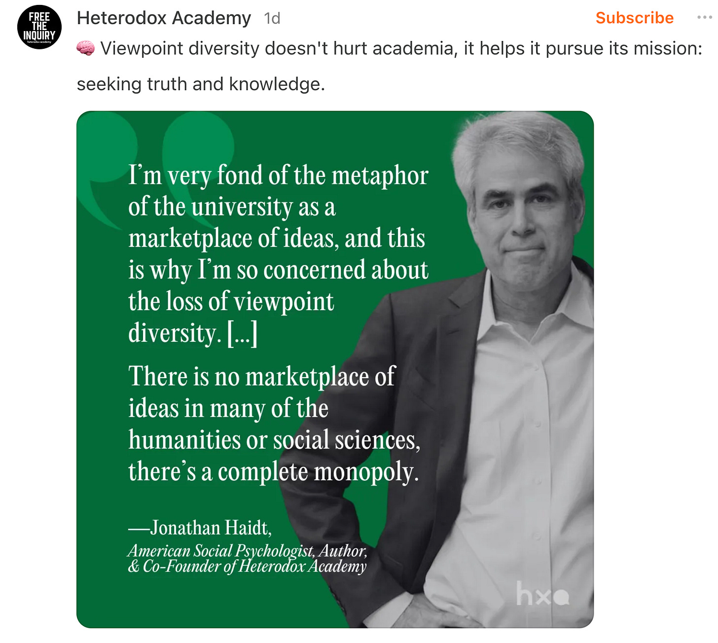 As I was writing this, I came across a Substack post that summarizes what many think of viewpoint diversity (and the lack of it in academia), featuring a nice quote from Jonathan Haidt.