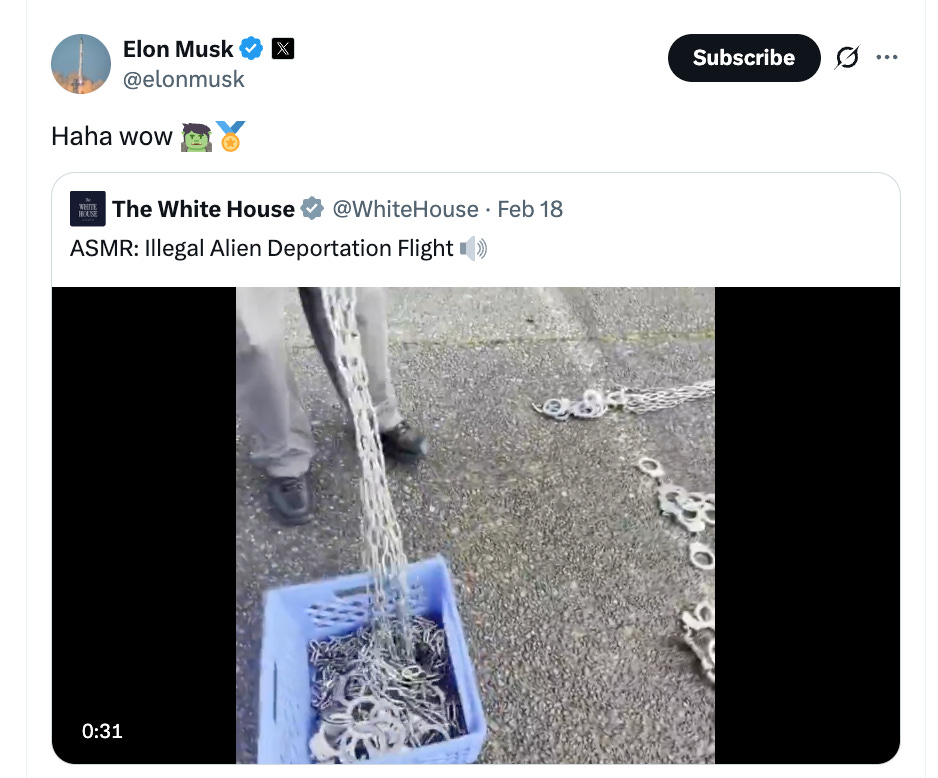 Earlier this year, the White House posted a video of immigrants in shackles being prepared to be deported. The heading they gave to the post said “ASMR: Illegal Alien Deportation Flight”, where ASMR, or “Autonomous Sensory Meridian Response,” refers to a pleasant feeling some people experience when hearing certain sounds.